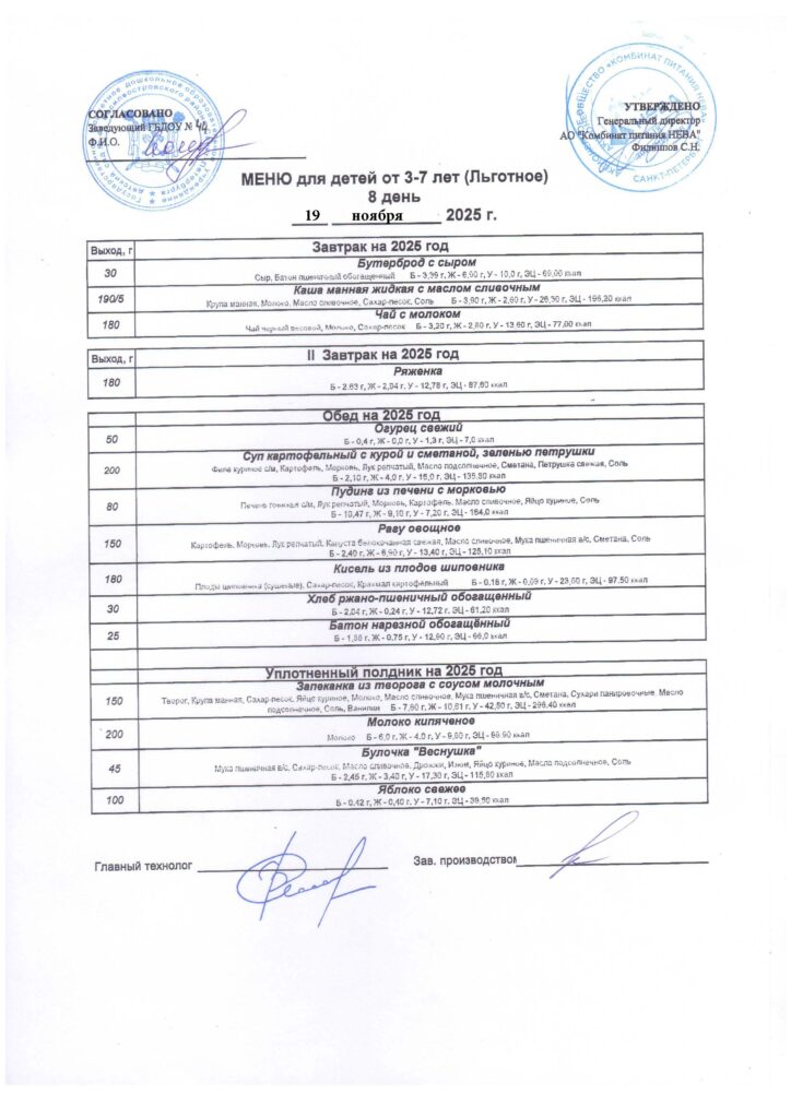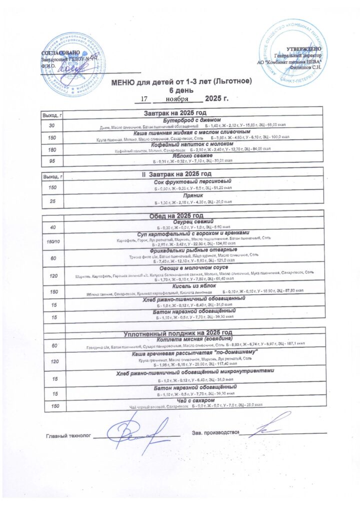 Организацию питания осуществляет АО » КП Нева» согласно контракту №44/ПИТ/от 24.08.2024, «На оказание услуг по организации горячего питания для нужд государственного бюджетного дошкольного образовательного учреждения детского сада № 44 Василеостровского района Санкт Петербурга в 2024 -2025 годах.»», и организовано 4-х разовое питание в соответствии с 10-дневным цикличным меню, утвержденным генеральным директором АО «КП Нева» С.Н.Филиппов.