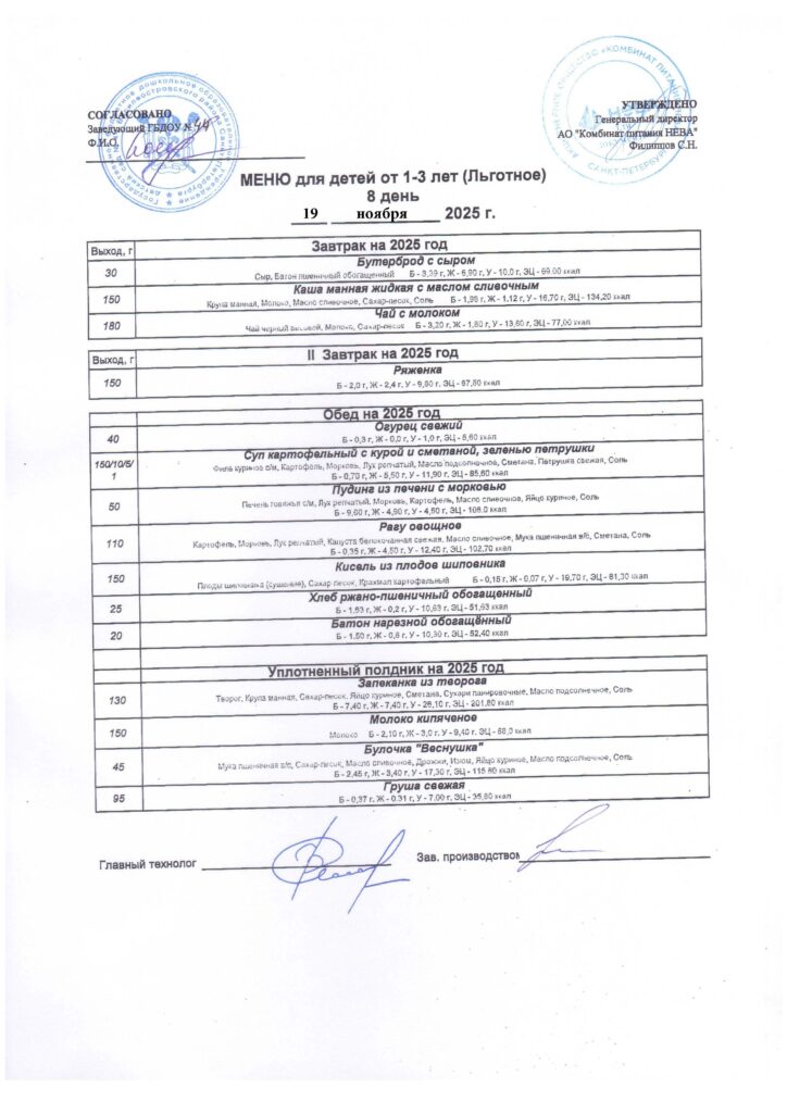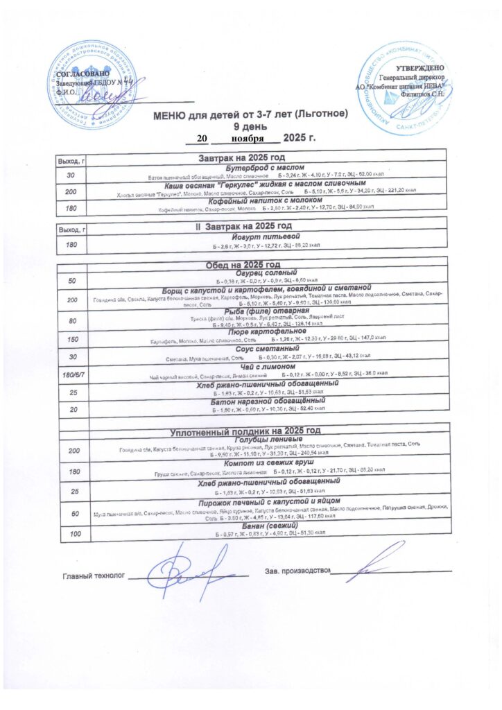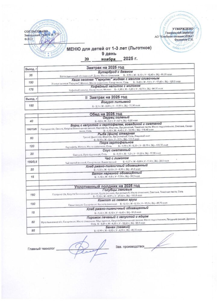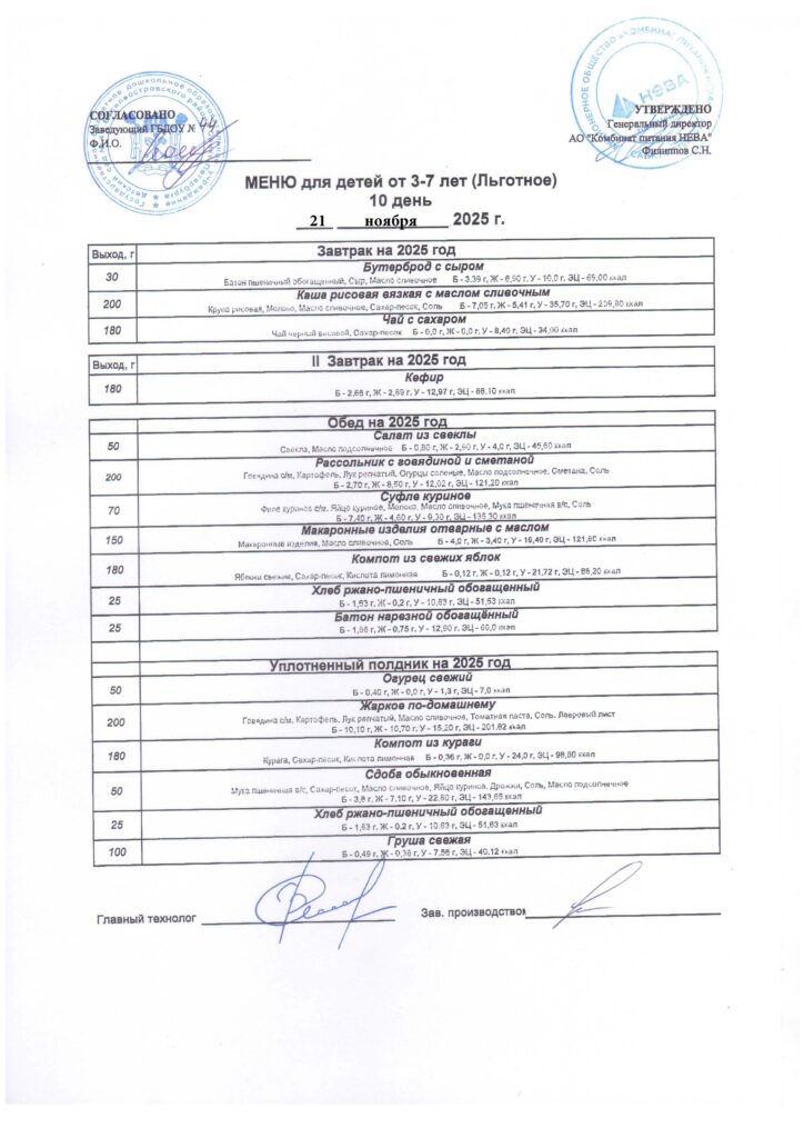 АО «КП Нева». Контракт № /ПИТ/24-26 от 24.08.2024 » На оказание услуг по организации горячего питания для нужд государственного бюджетного дошкольного образовательного учреждения детского сада № 44 Василеостровского района Санкт Петербурга в 2024 — 2025 годах.»