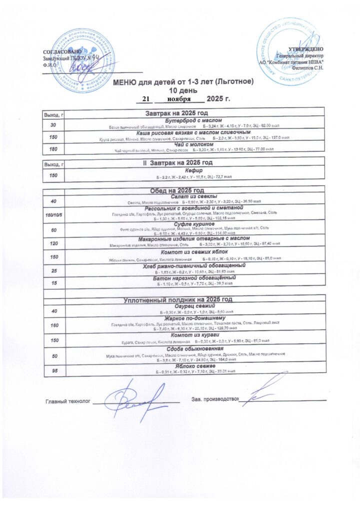 Цикличное десятидневное меню для организации питания детей с 1 года до 3 лет